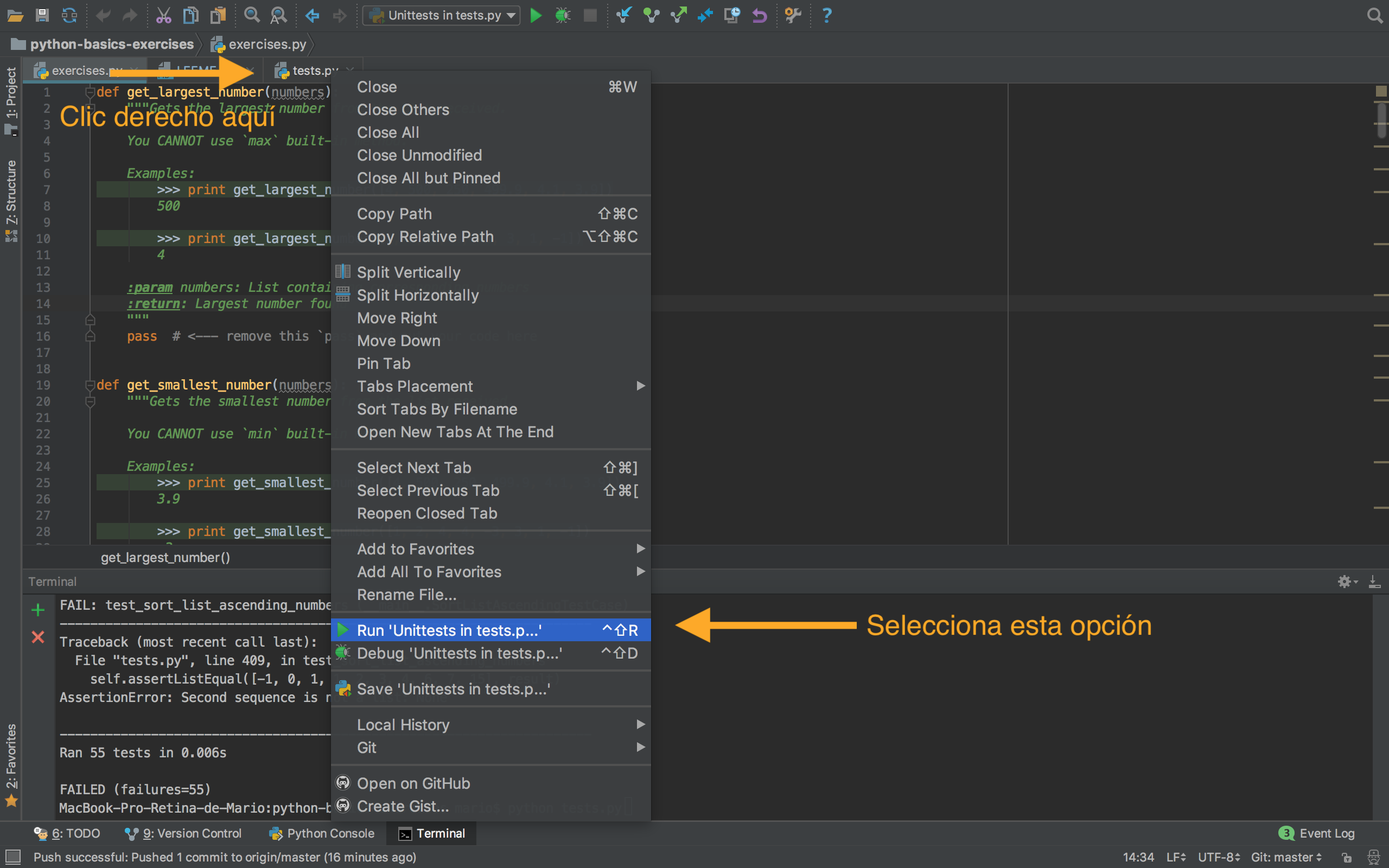 Desde pycharm. Si usas pycharm, solo tienes que abrir el fichero tests.py, hacer clic derecho en la pestaña del fichero y seleccionar Run 'Unittests in tests.py' en el desplegable.