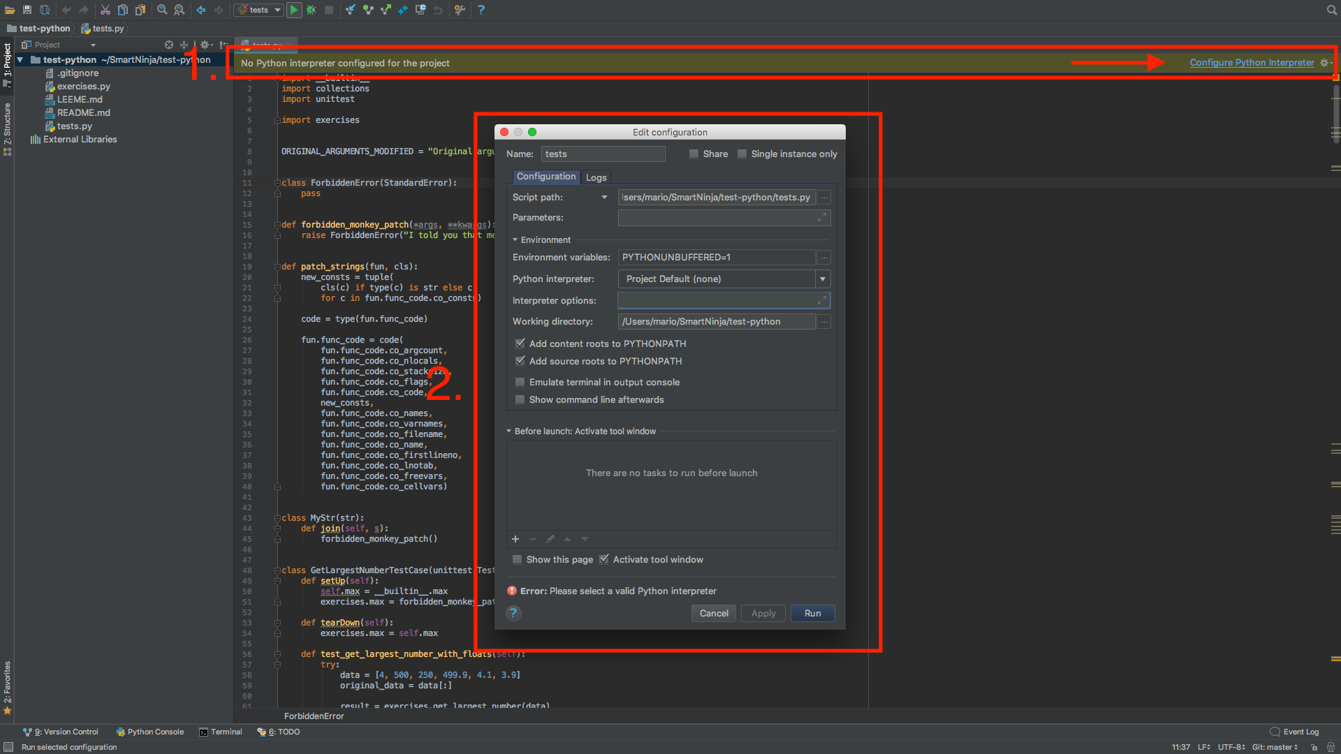 Si ves alguno de los mensajes señalados en la imagen de arriba al abrir un fichero python del proyecto o intentar ejecutar los tests, entonces tienes que seguir estos pasos:
