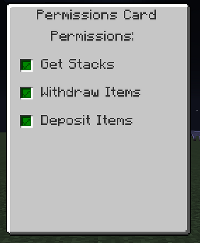 The permissions card is used with the player interface and tells the interface what it is allowed to do to different player's inventories. Before editing the card, you have to link it to yourself by right clicking with it in your hand. After it is linked, you can edit the permissions of that card by sneaking and right clicking. After editing the permissions to how you'd like them, you can place the card in a player interface.