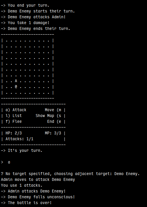 The map will distribute the combat participants along the map. When the map is rendered for a player the characters on the map are represented by a single character (sigil). Enemies are represented by A-Z, friendlies are represented by 0-9, the current player is represented by @. This sigil can be used by the player for targeting.
