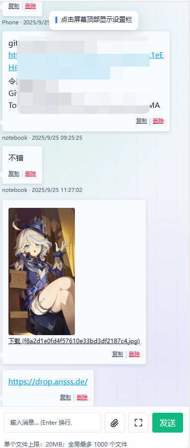 AUTO_CLEANUP_ENABLED、CLEANUP_INTERVAL_MINUTES、MESSAGE_TTL_DAYS、DEVICE_INACTIVE_DAYS - 上传限制:
