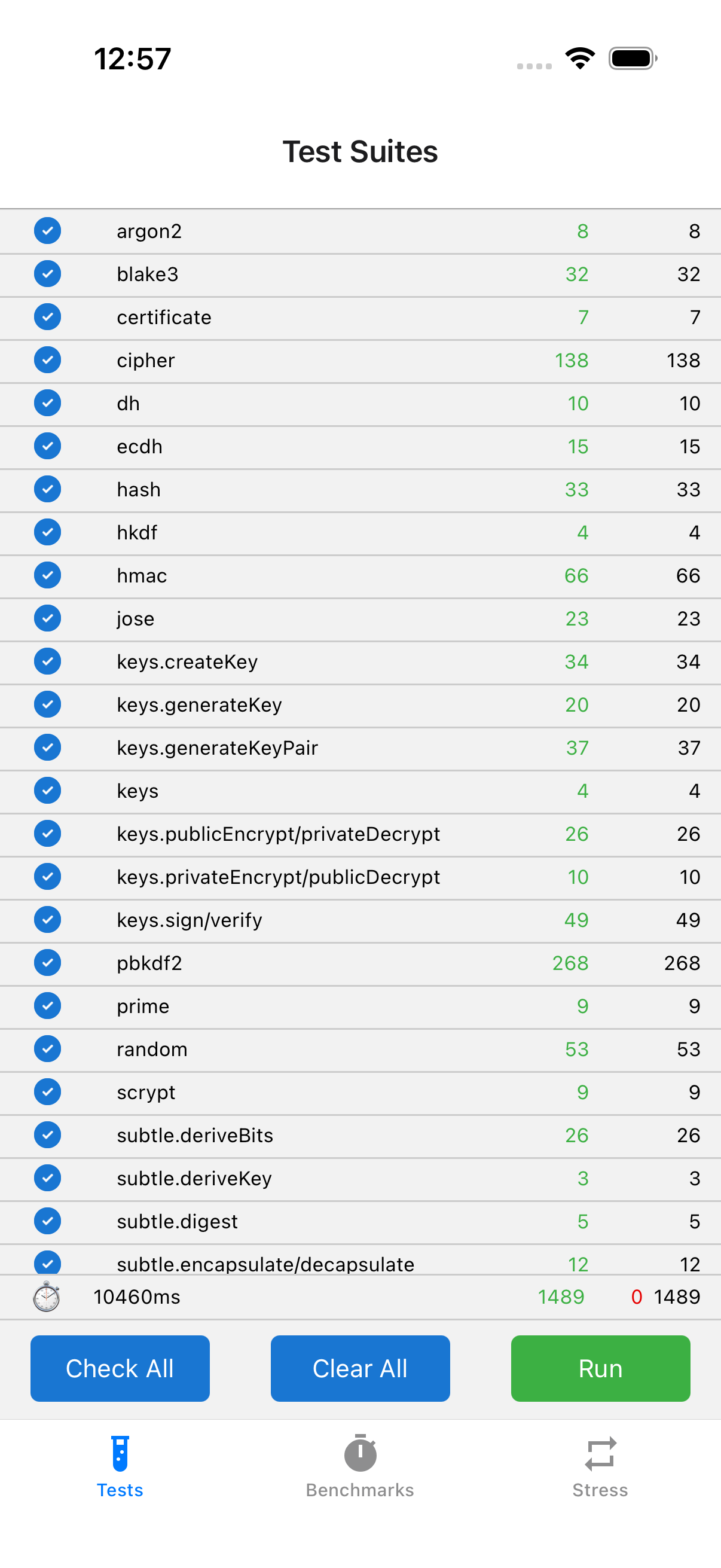 Tests run in the React Native example app. Test suite: