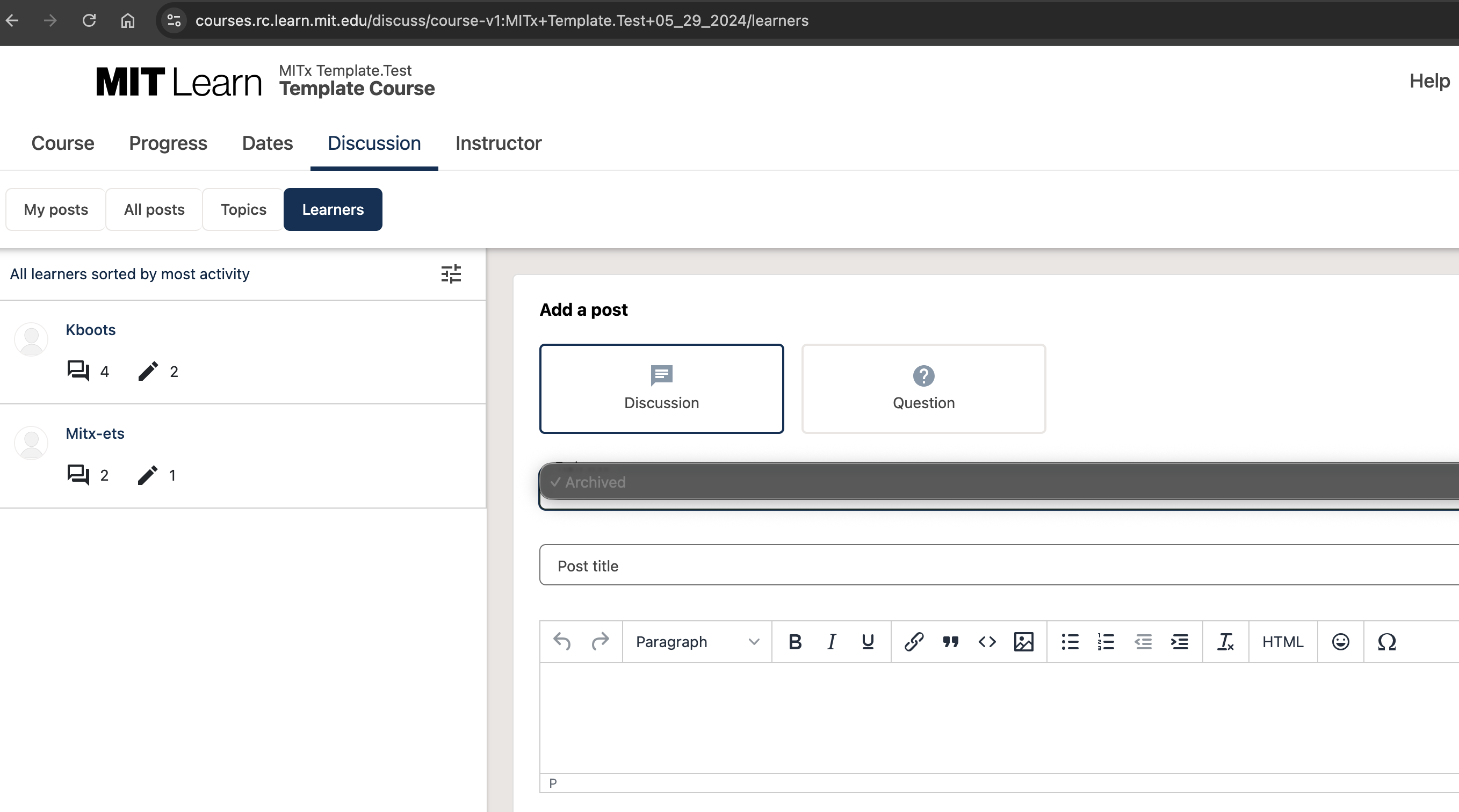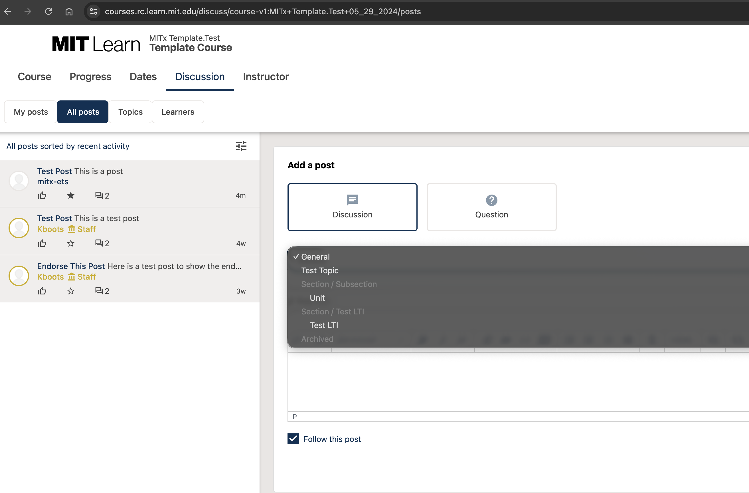 ### Steps to Reproduce - Go to the learners tab directly via a link in the discussions MFE. - Click "Add Post" - No topics appear. See screenshot  1. Navigate to "All Posts." 1. Now, the Topics appear, see screenshot
